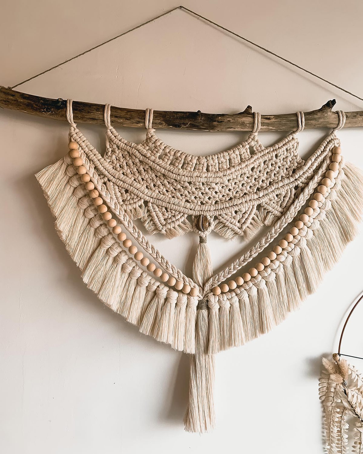 Cette décoration en macramé est confectionnée minutieusement à la main à partir de coton bio, de bois flotté et de perles en bois naturel.